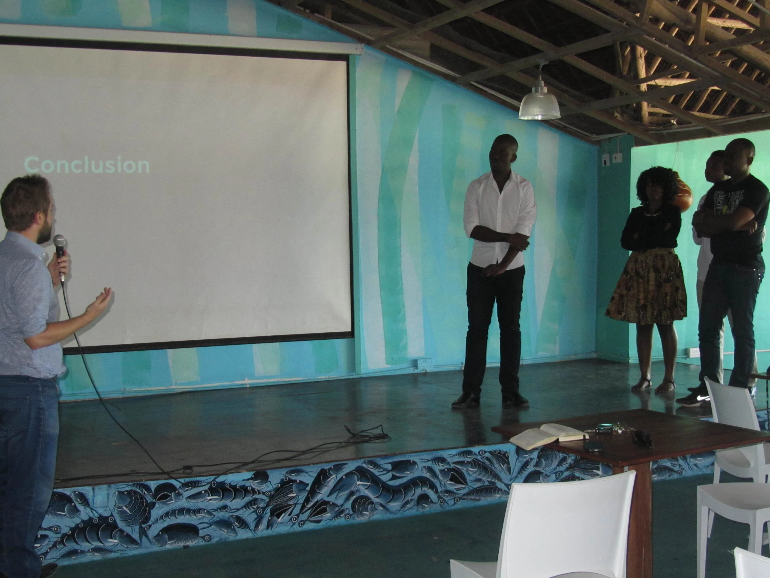 A man in a light blue shirt holding a microphone presents on a stage with a large white screen displaying the word 'Conclusion.' Four other people stand to the right of the stage, observing the presentation in a room with teal walls and wooden ceilin