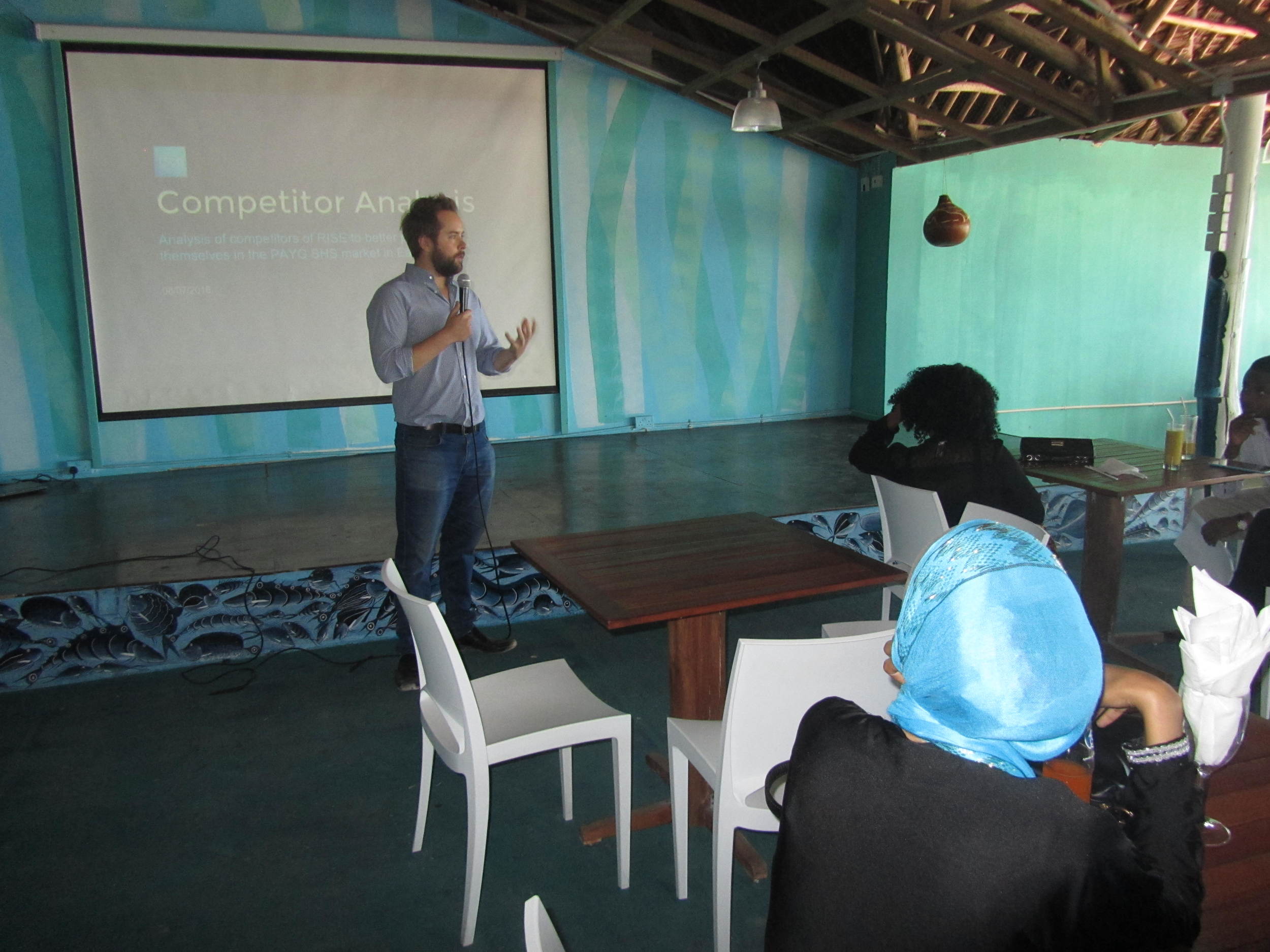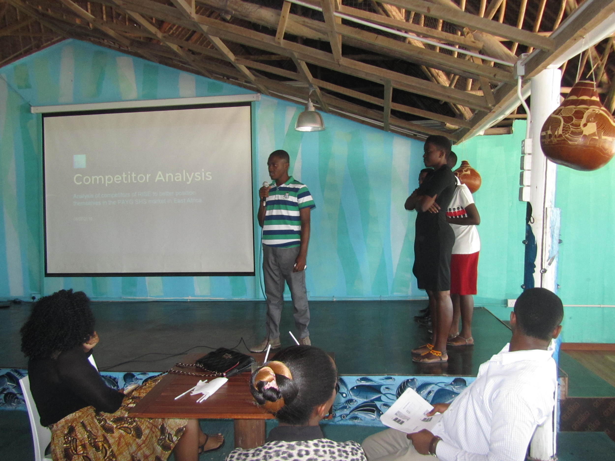 A presentation on 'Competitor Analysis' being given by a young man in a striped shirt in front of an audience in a room with wooden ceiling beams and hanging decorative pots.
