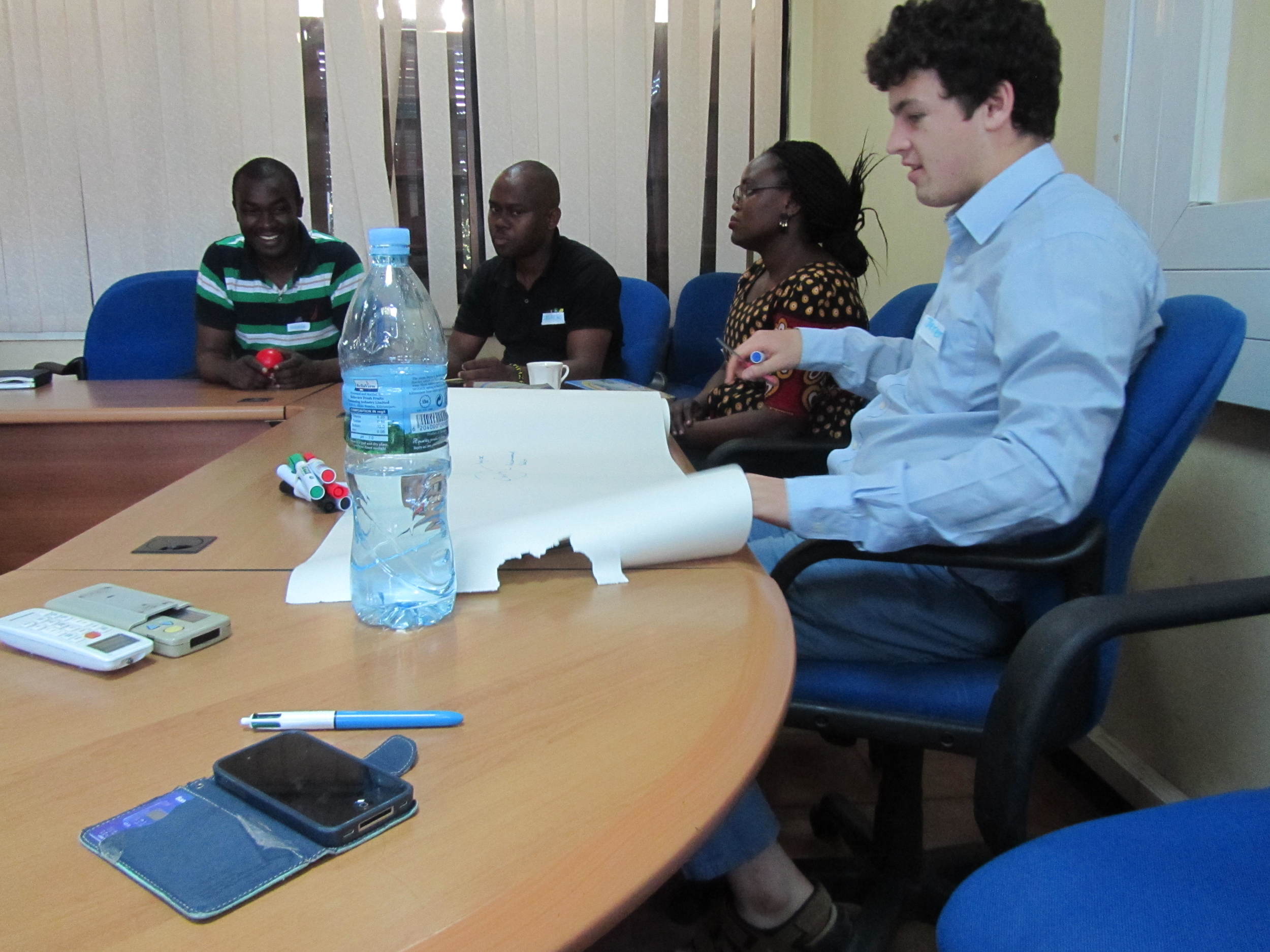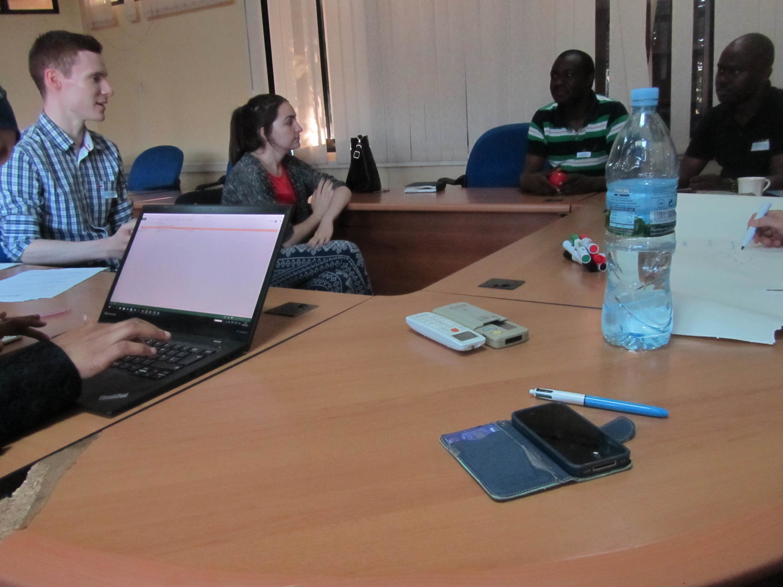 A group of five people sitting around a large conference table, some with laptops, a water bottle, markers, and other office supplies, in a meeting room.