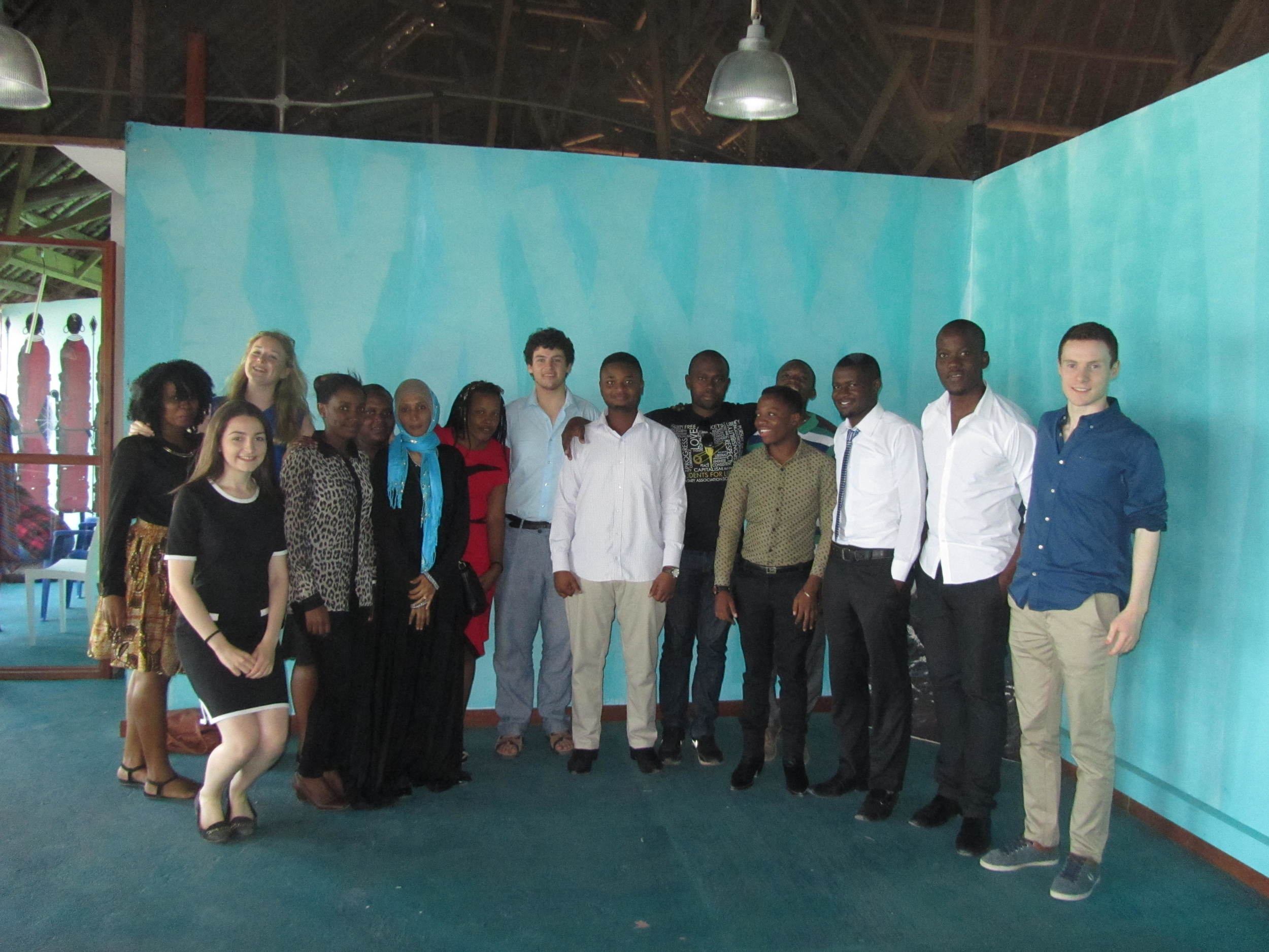 Group of people standing together indoors against a blue wall, posing for a photo