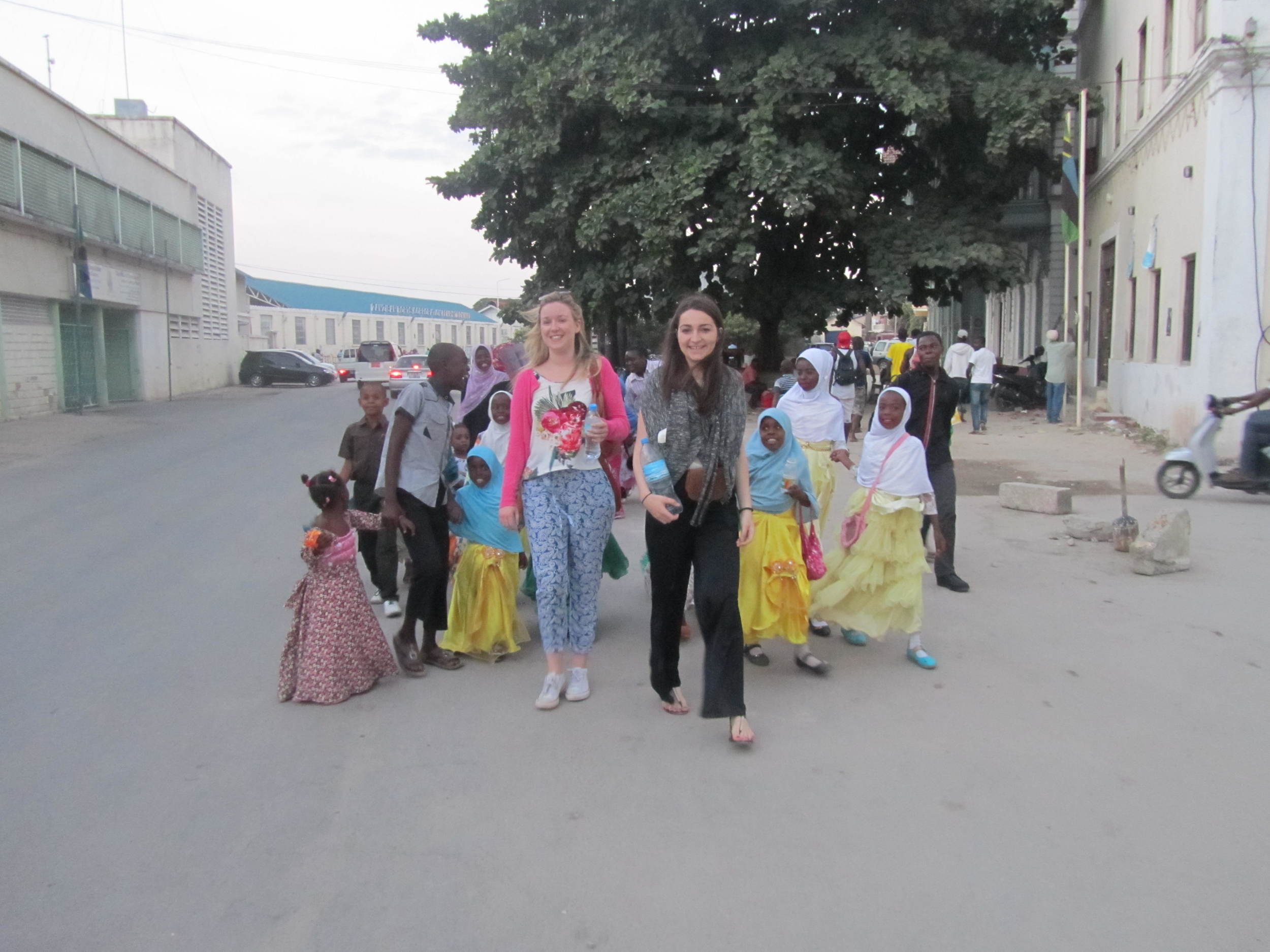 Two women walking and smiling in front of a group of children and adults, some of whom are dressed in yellow and white dresses, on a street with buildings and cars in the background.