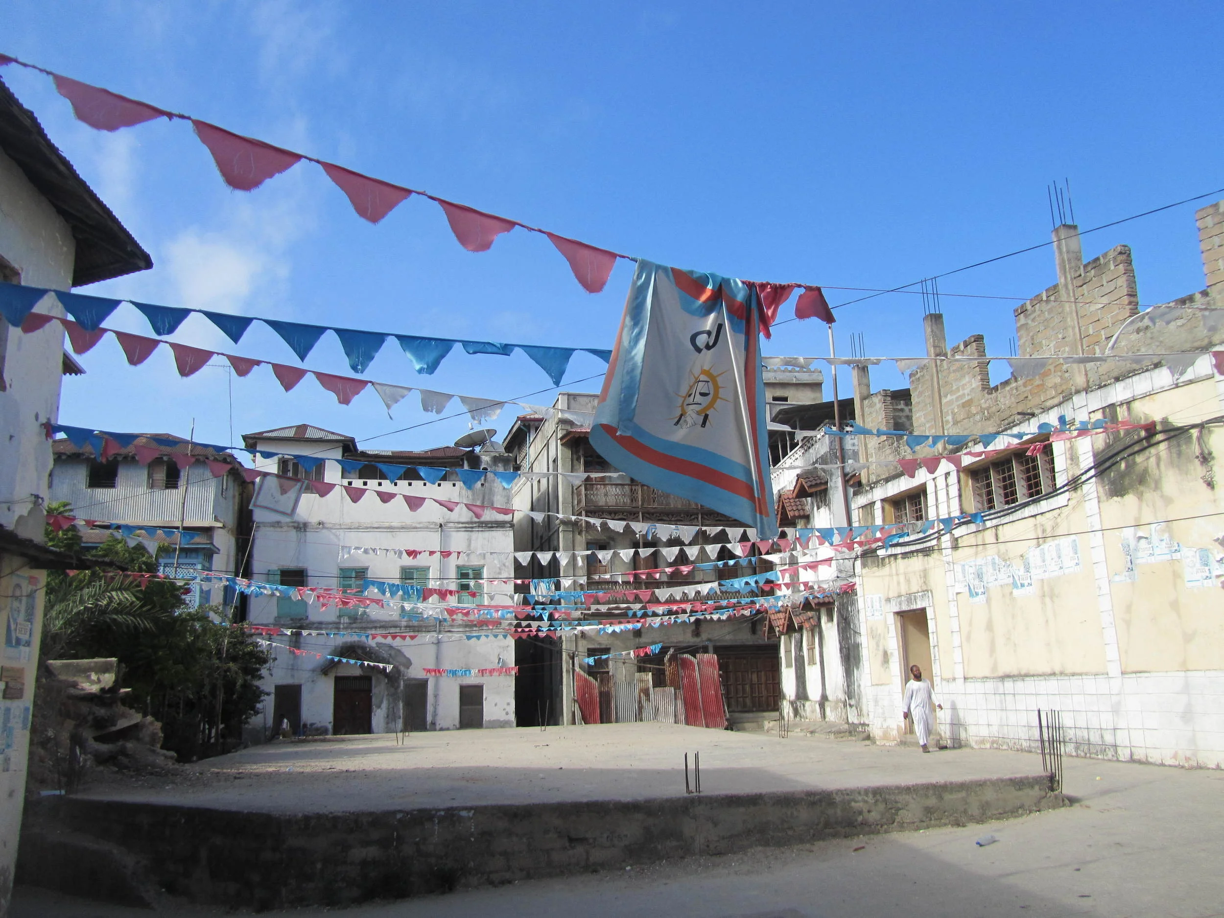 A street scene with colorful triangular flags strung across an open space, surrounded by old buildings with unfinished or worn facades, and a person walking in the background on the right side.