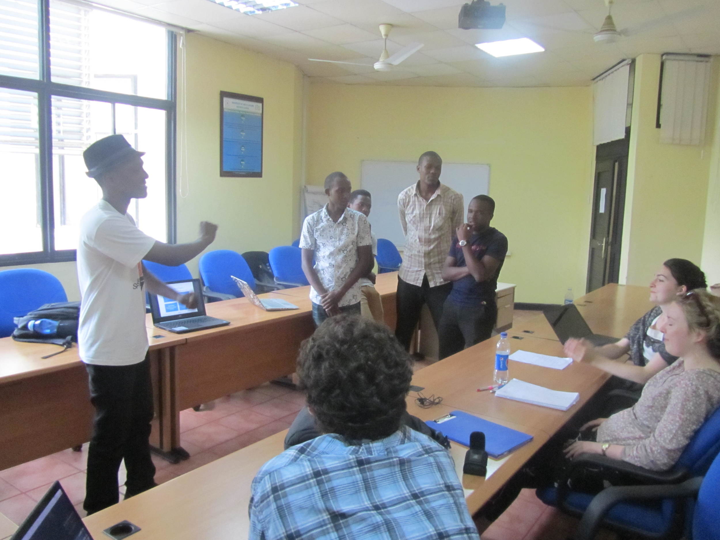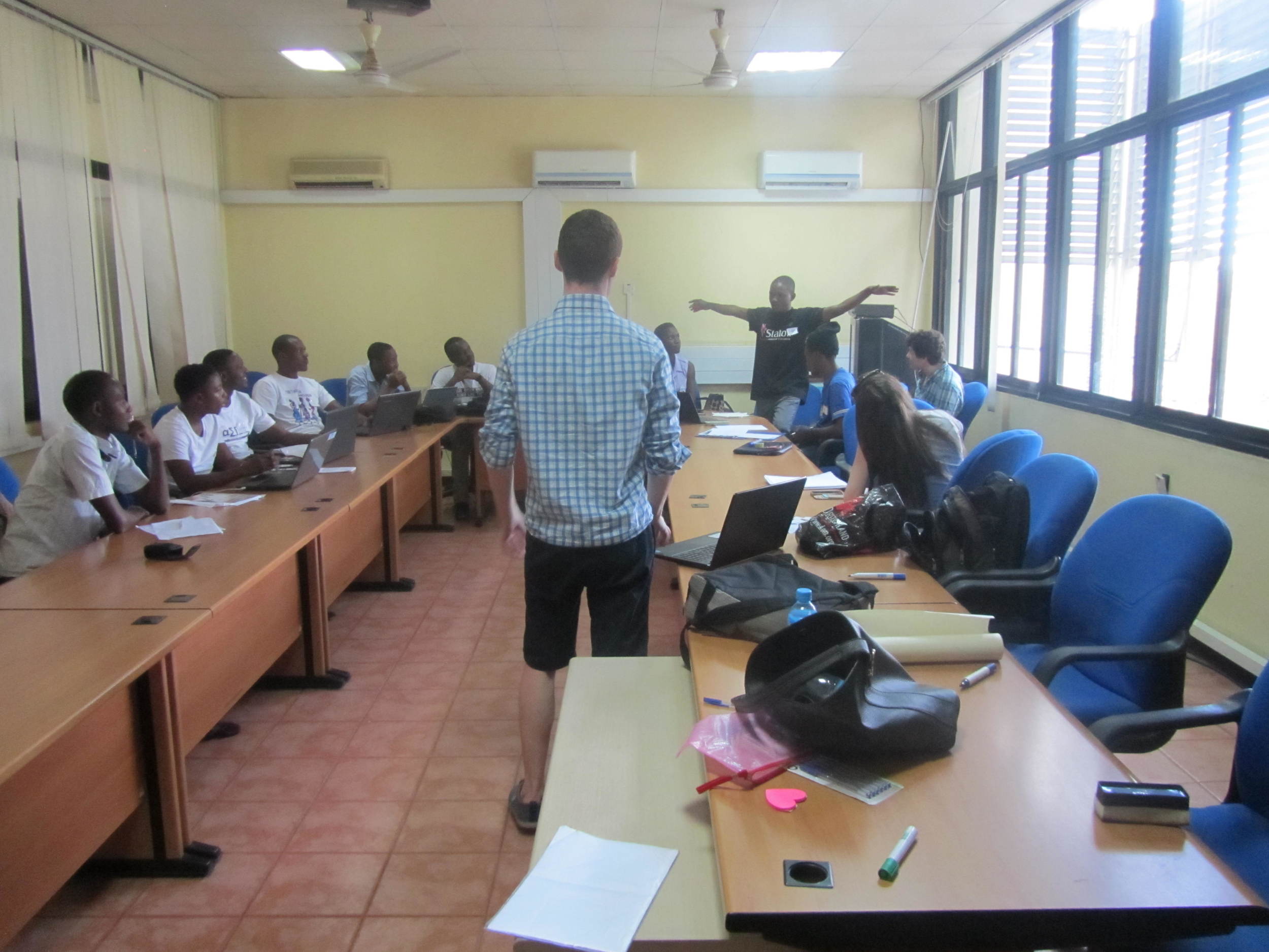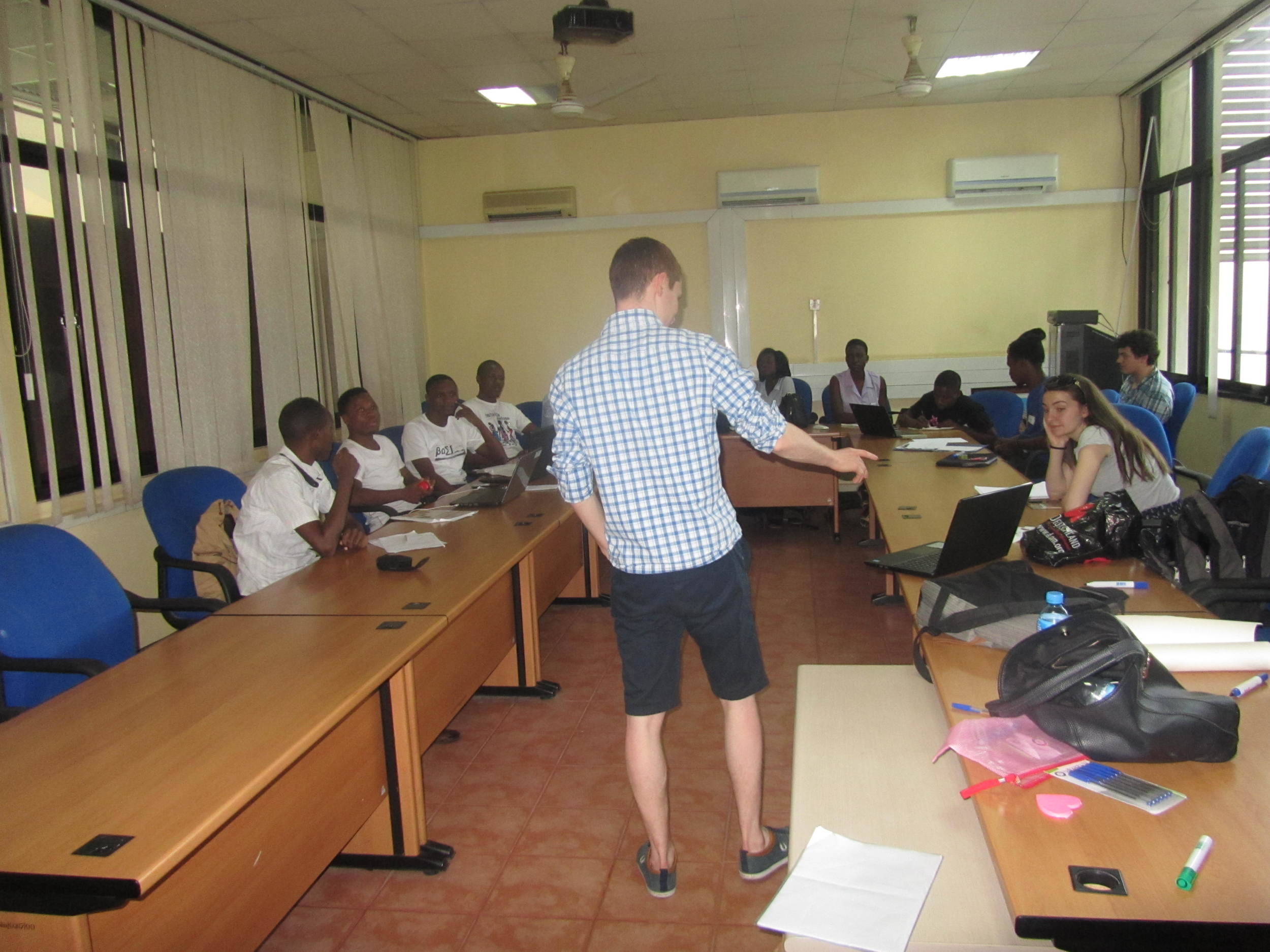 A classroom or meeting room with a man standing in front of people seated around a rectangular table, equipped with laptops and notebooks. The room has windows on one side, air conditioning units on the wall, and ceiling fans.