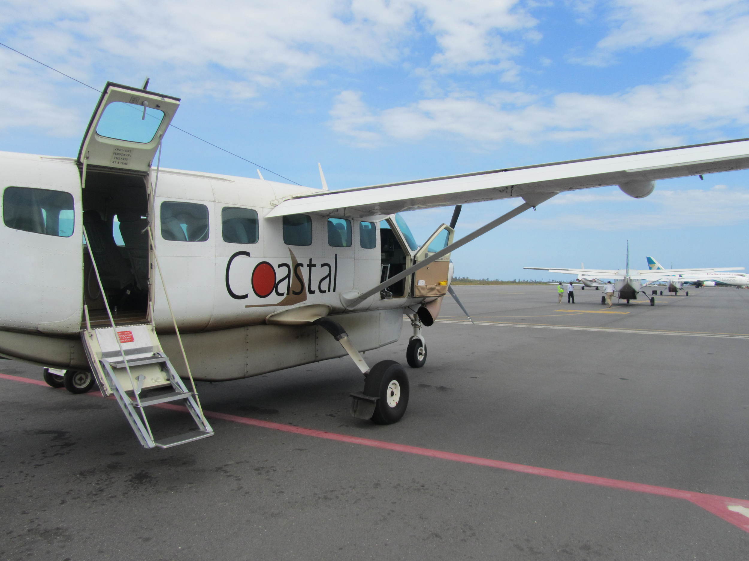Small white airplane with 'Coastal' on the side, parked on an airport tarmac with stairs at the entrance, in the background are additional airplanes and airport staff.