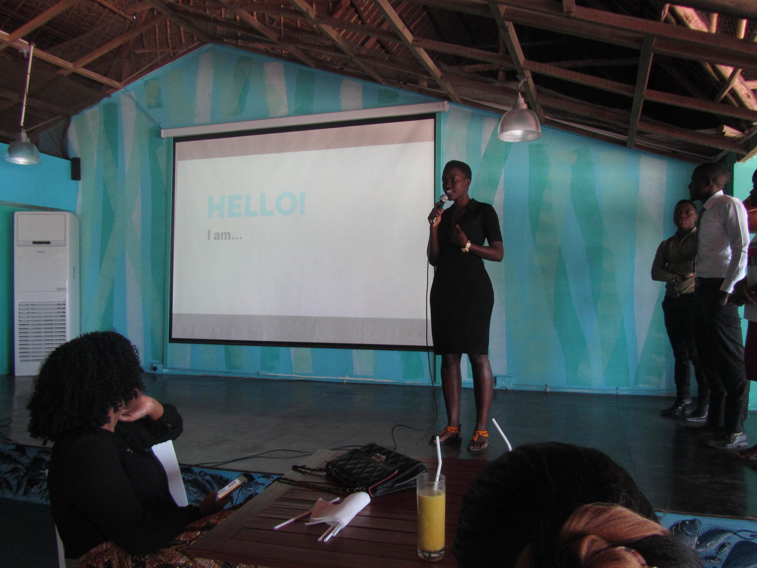 A woman dressed in black standing on a stage with a microphone, giving a presentation in front of a projection screen that says 'HELLO! I am...' in a room with a blue-themed wall and a wooden ceiling. Several people are seated and observing, with one
