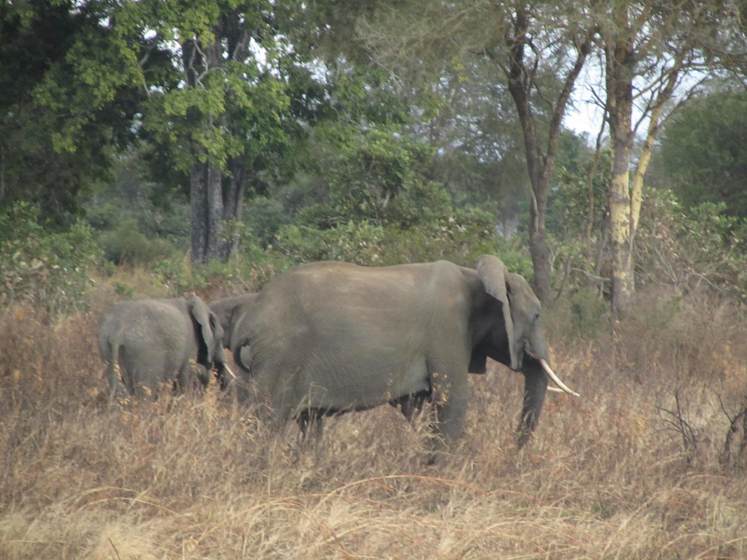 A herd of elephants walking through a grassy area with trees in the background