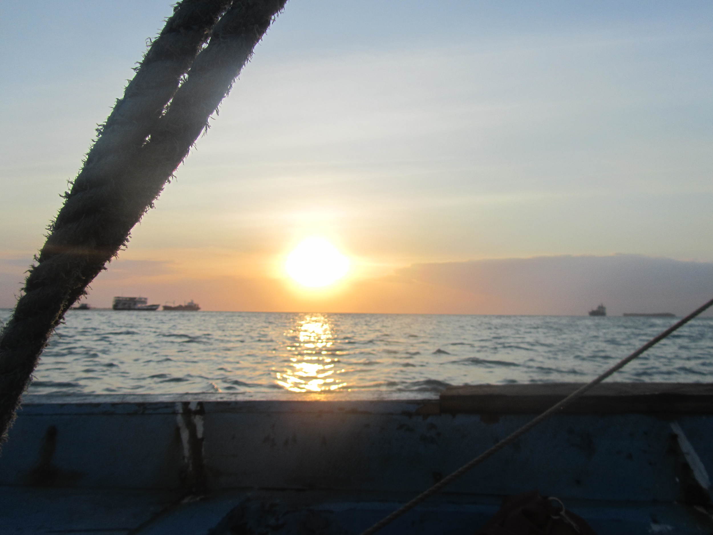 Sunset over the ocean viewed from a boat, with the boat's side and a ropes in the foreground.