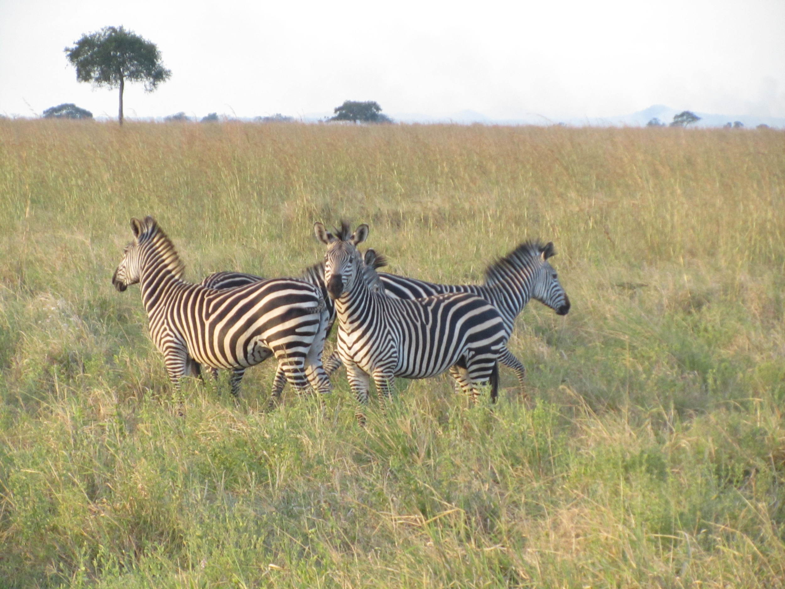 Three zebras standing in tall grass in a savannah landscape.