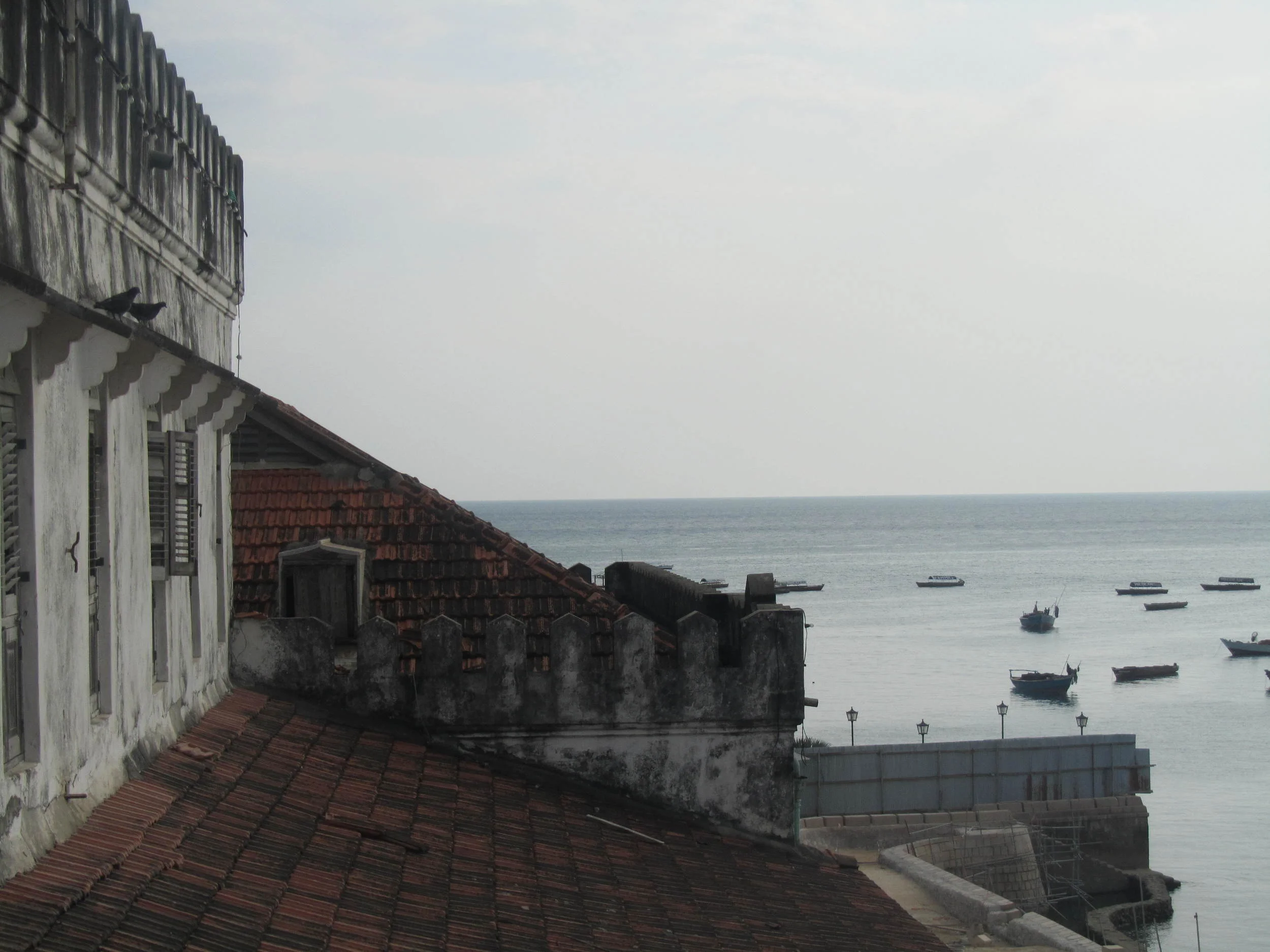 View of old buildings with tiled roofs overlooking a calm sea with several boats anchored. The scene appears overcast.
