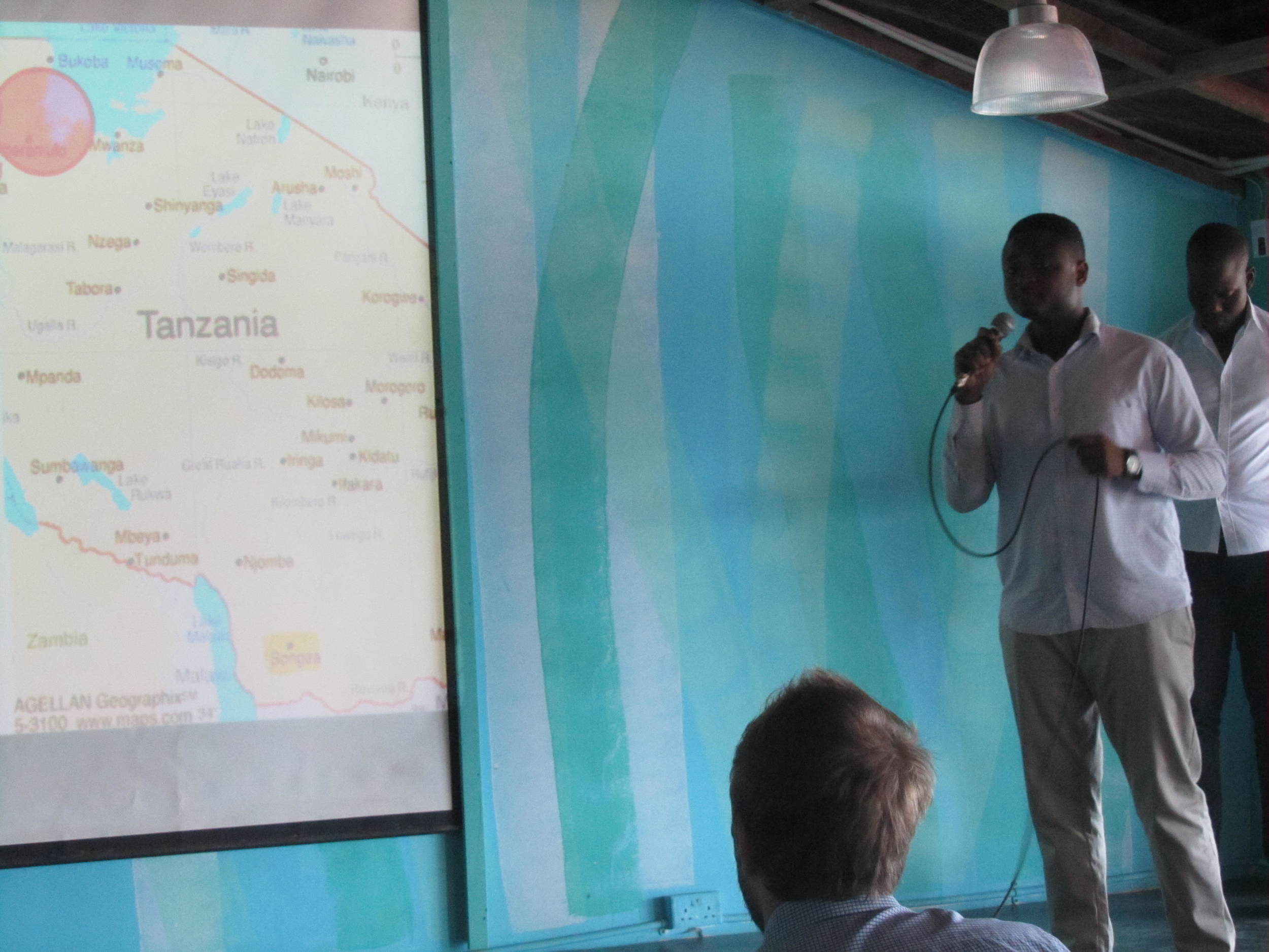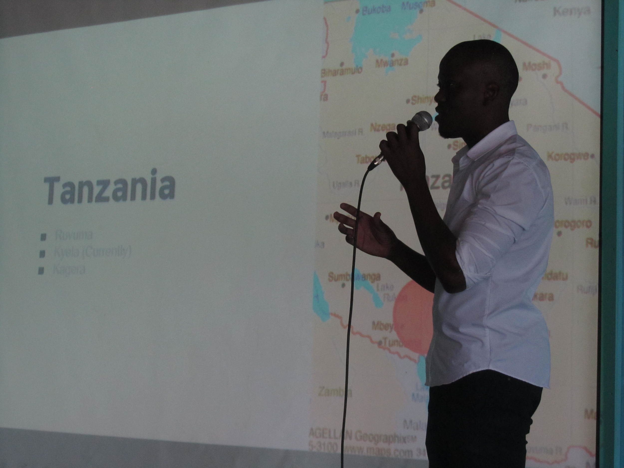 A man in a white shirt holding a microphone, standing in front of a blue wall with a map of Tanzania projected on a screen, with an audience member visible in the foreground.