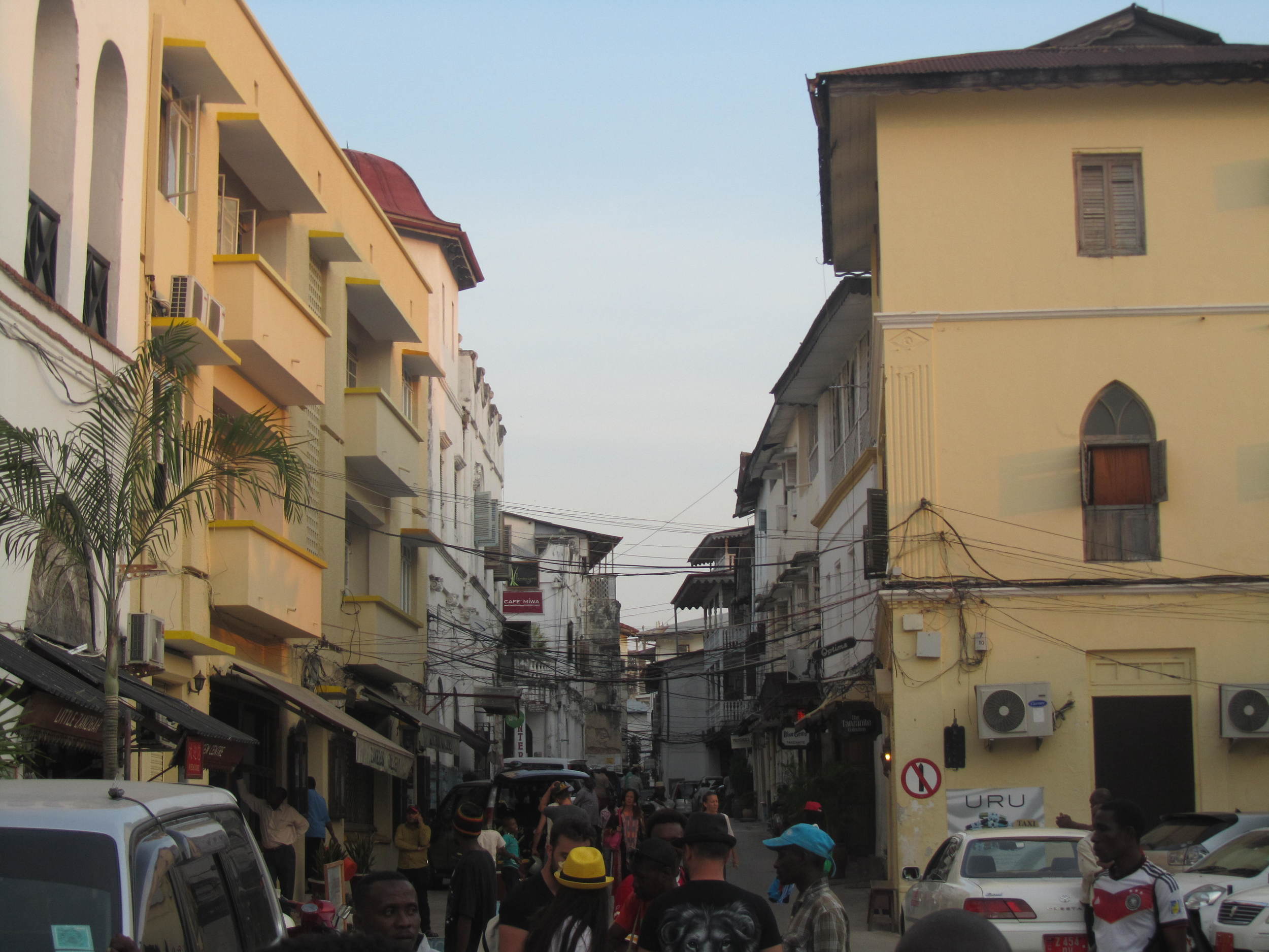 Street scene in a busy urban area with multi-story buildings, cars, and pedestrians.