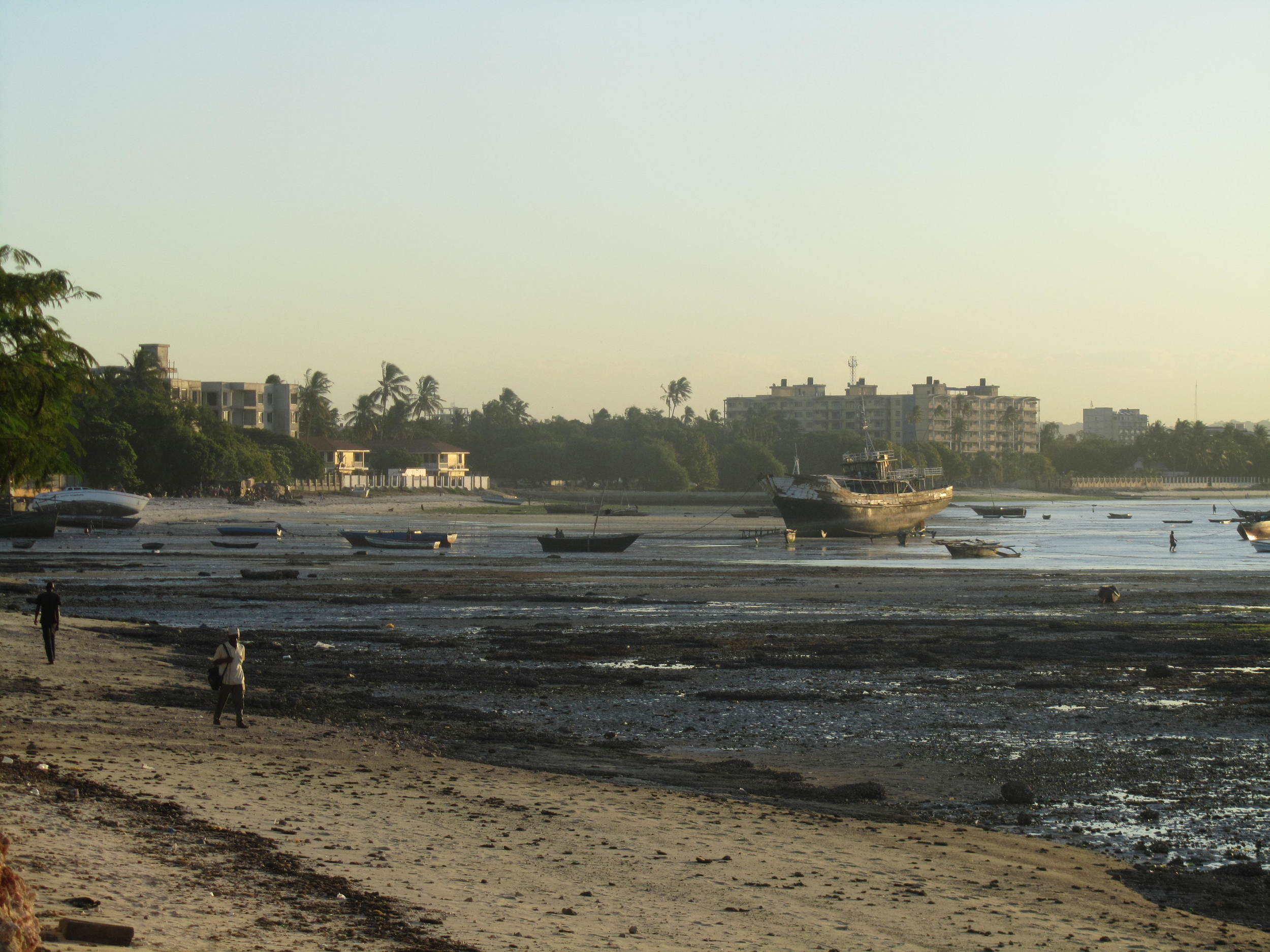 A beach scene during low tide with boats anchored on the exposed sand and a few people walking along the shoreline, with buildings and palm trees in the background.