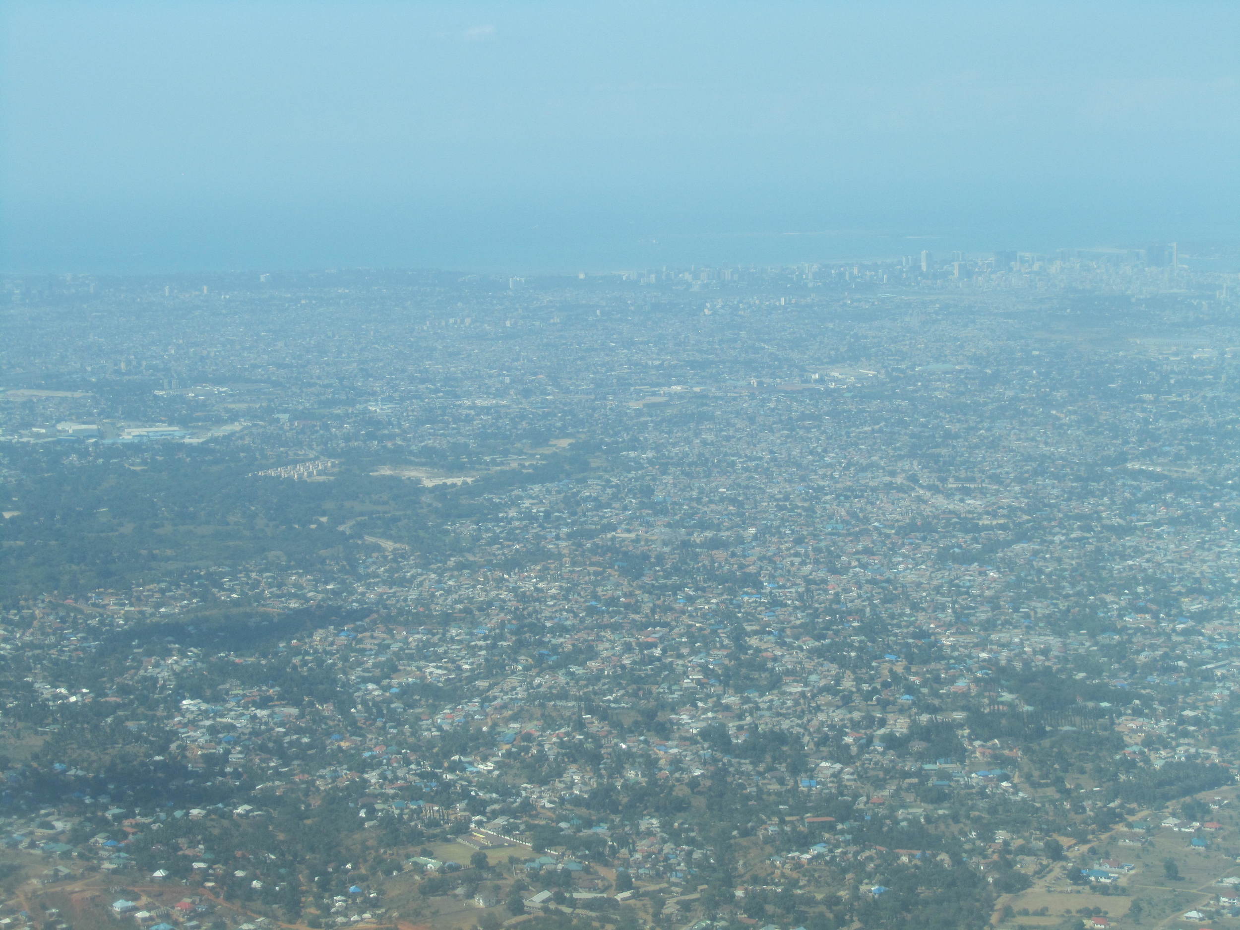 A wide aerial view of a densely populated cityscape with numerous buildings and streets, extending to the horizon under a blue sky.