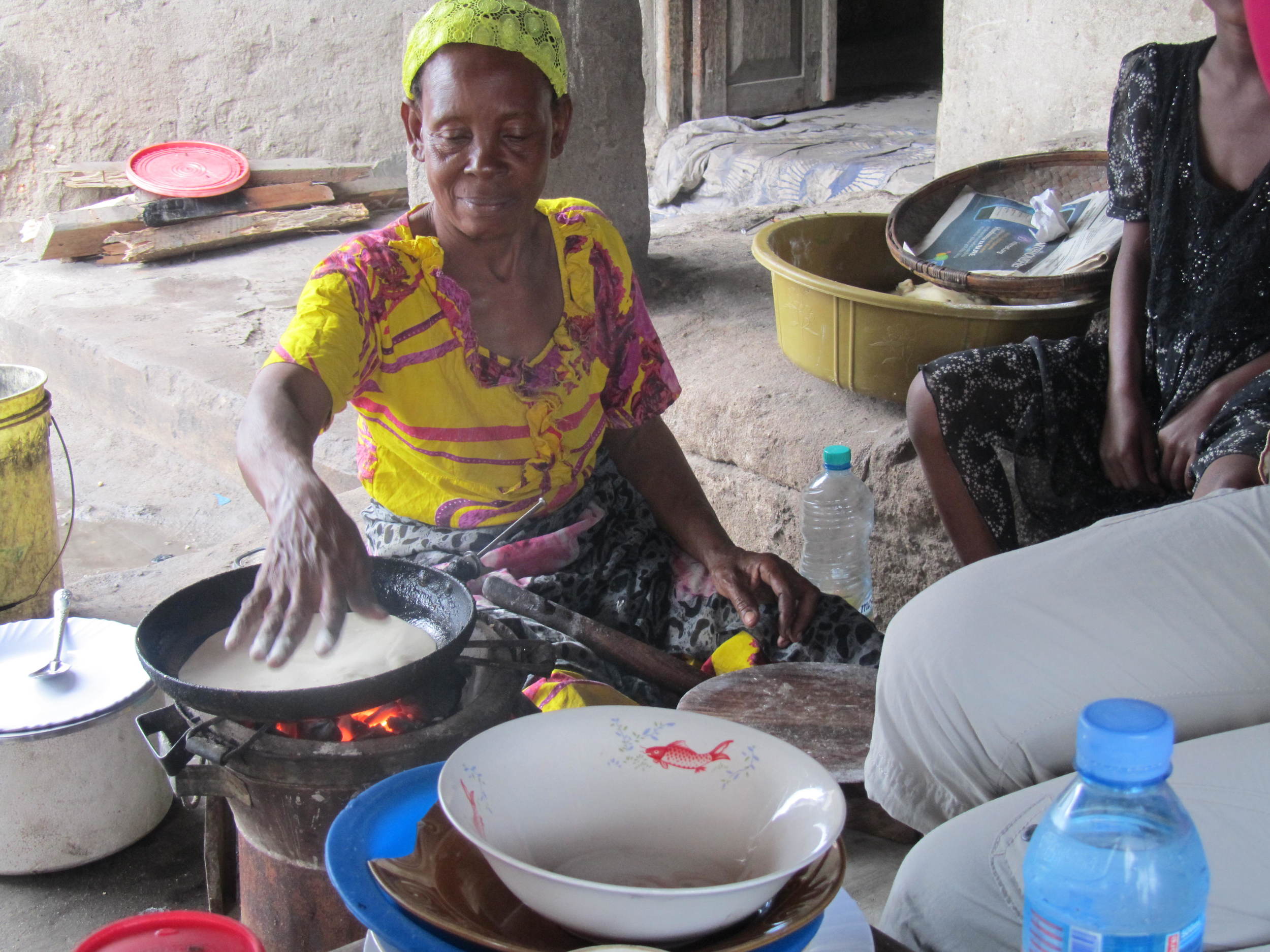 An elderly woman cooking a traditional dish over an open flame, surrounded by bowls, plates, and a water bottle in an outdoor setting.