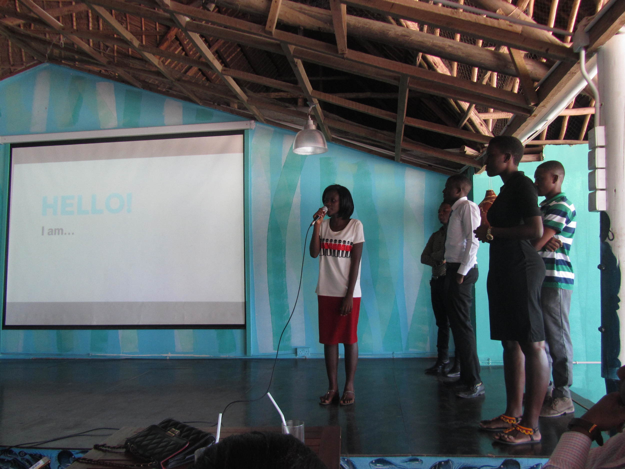 A woman is speaking into a microphone on stage during a presentation, with a group of people standing behind her. A projection screen displays 'HELLO! I am...' in the background. The setting appears to be a wooden, open-air venue.