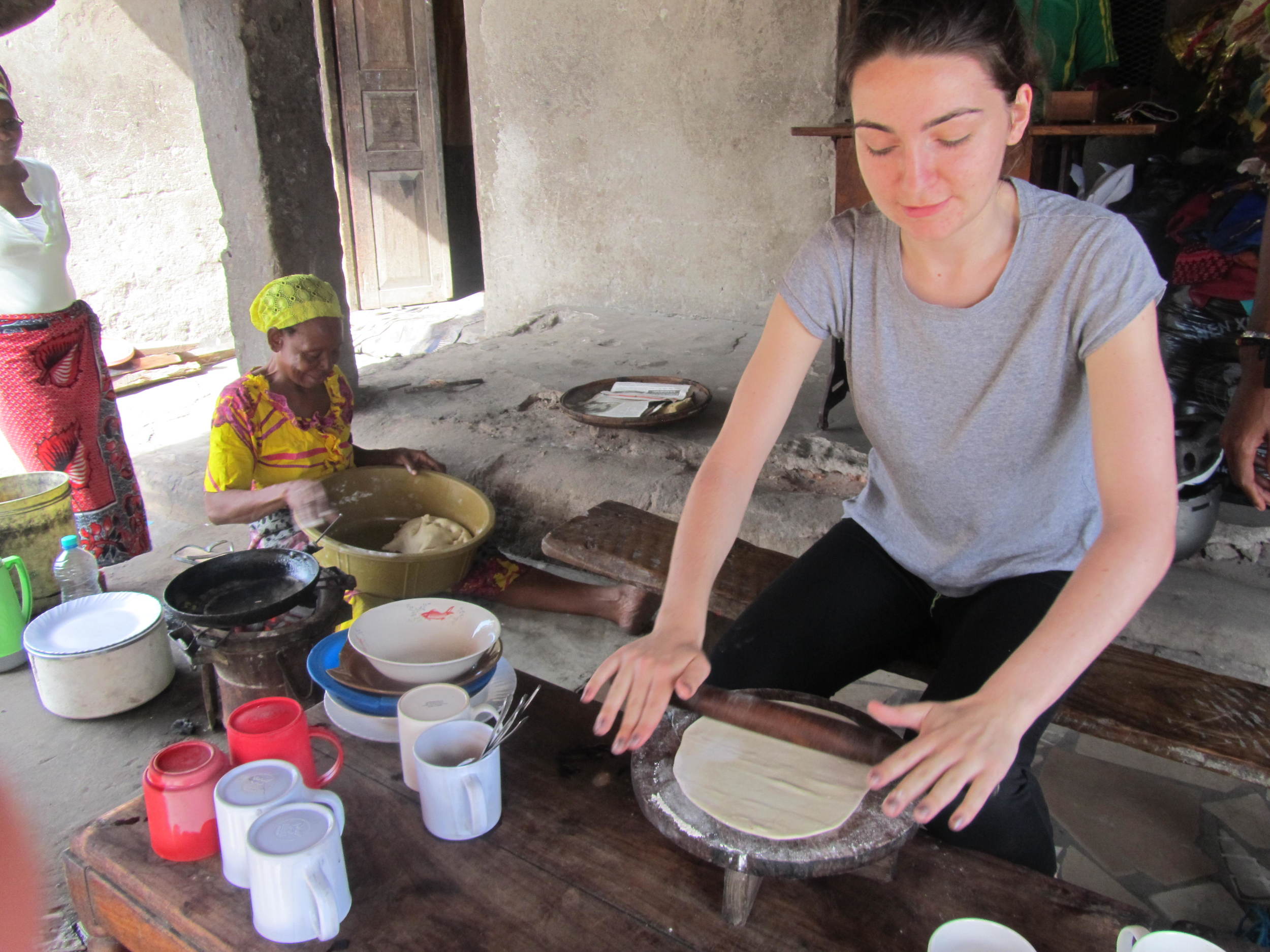 A woman rolling dough with a rolling pin in a rustic room with women in colorful clothing in the background.