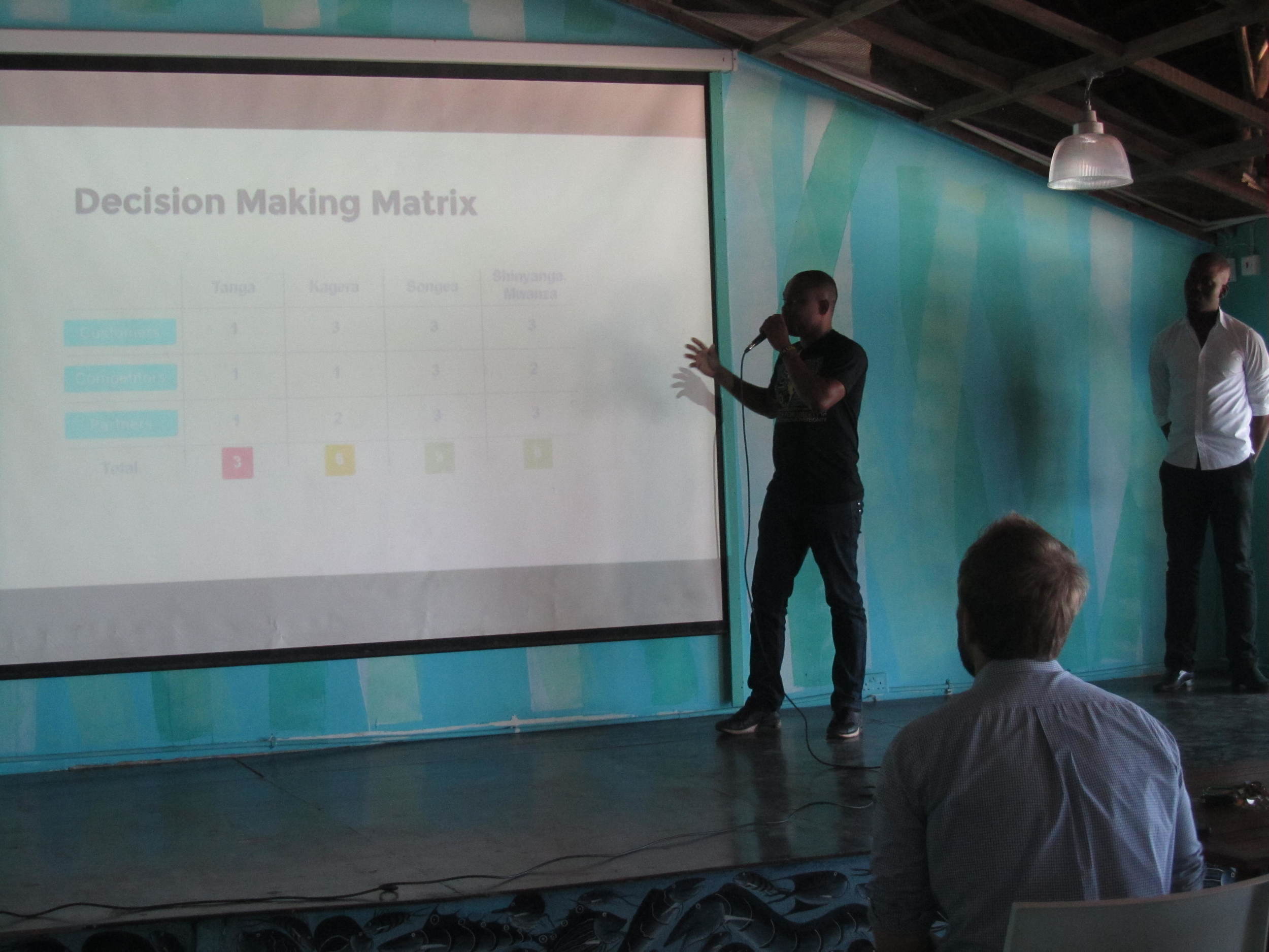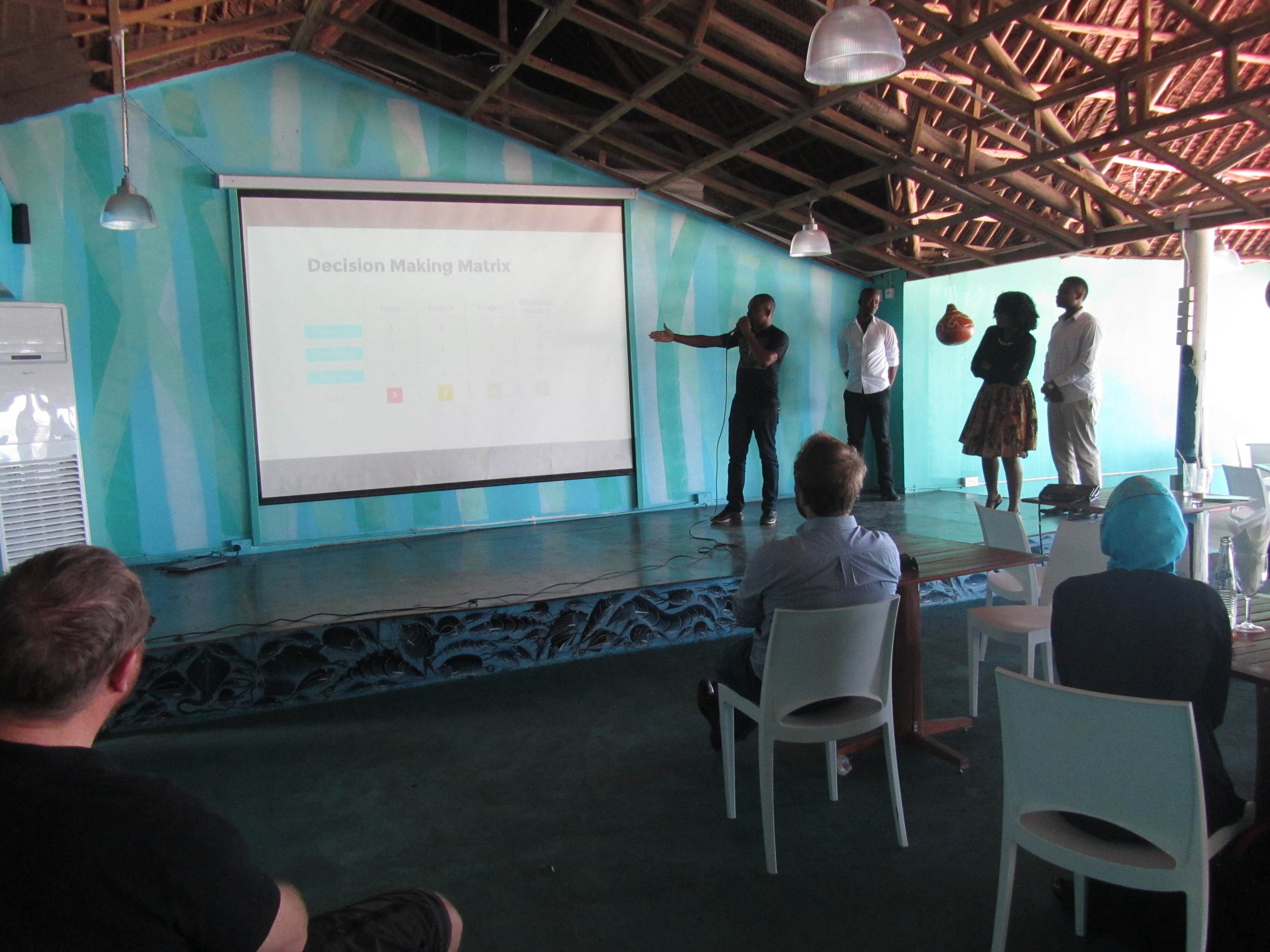 A presentation taking place in a room with wooden roof beams and teal painted walls. Four people are on stage; one person is speaking, pointing to a screen displaying a 'Decision Making Matrix'. Seated audience members are watching the presentation.