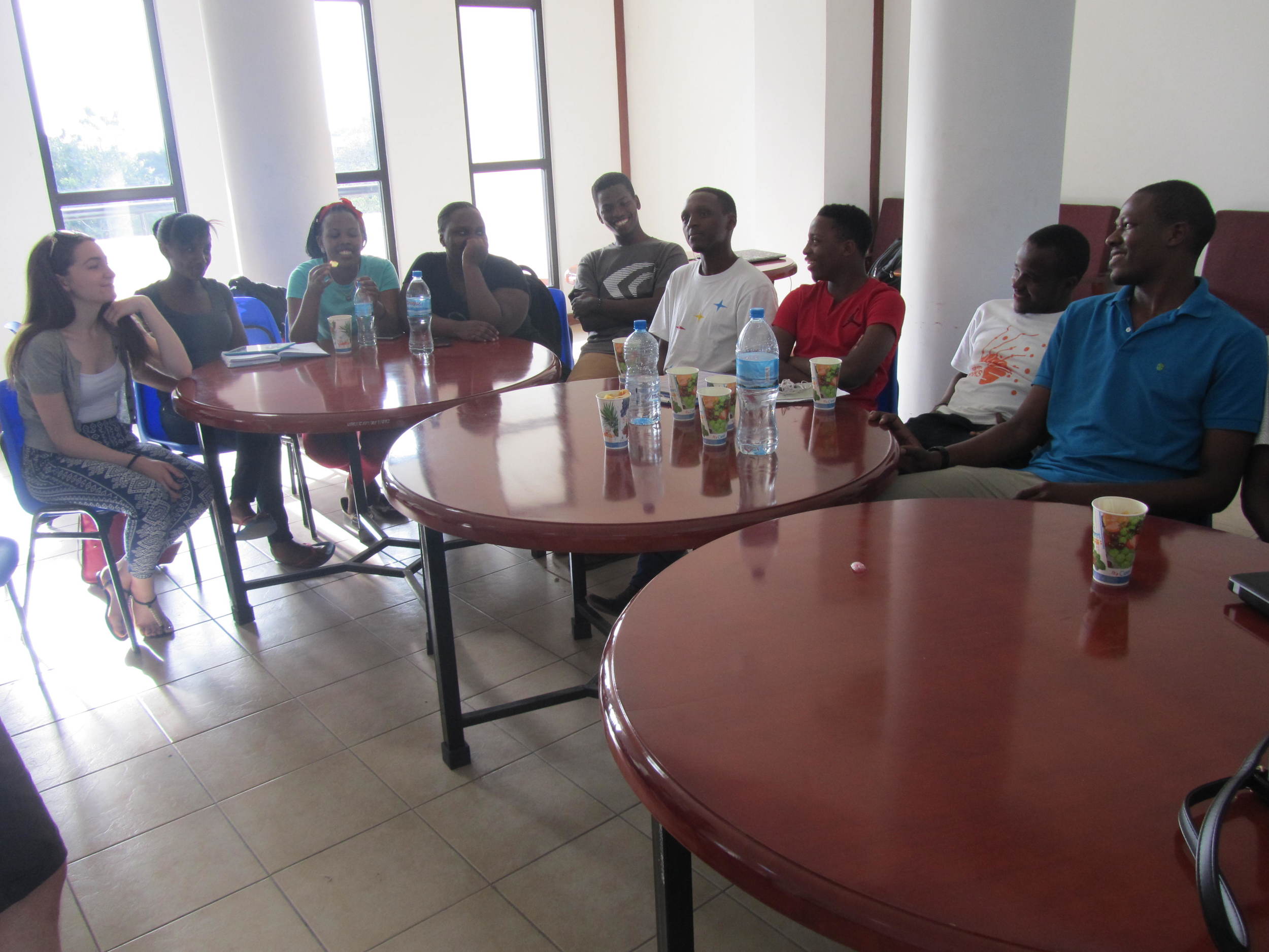 Group of nine people sitting at two round tables in a bright room, smiling and engaging in conversation, with bottled water and disposable cups on the tables.