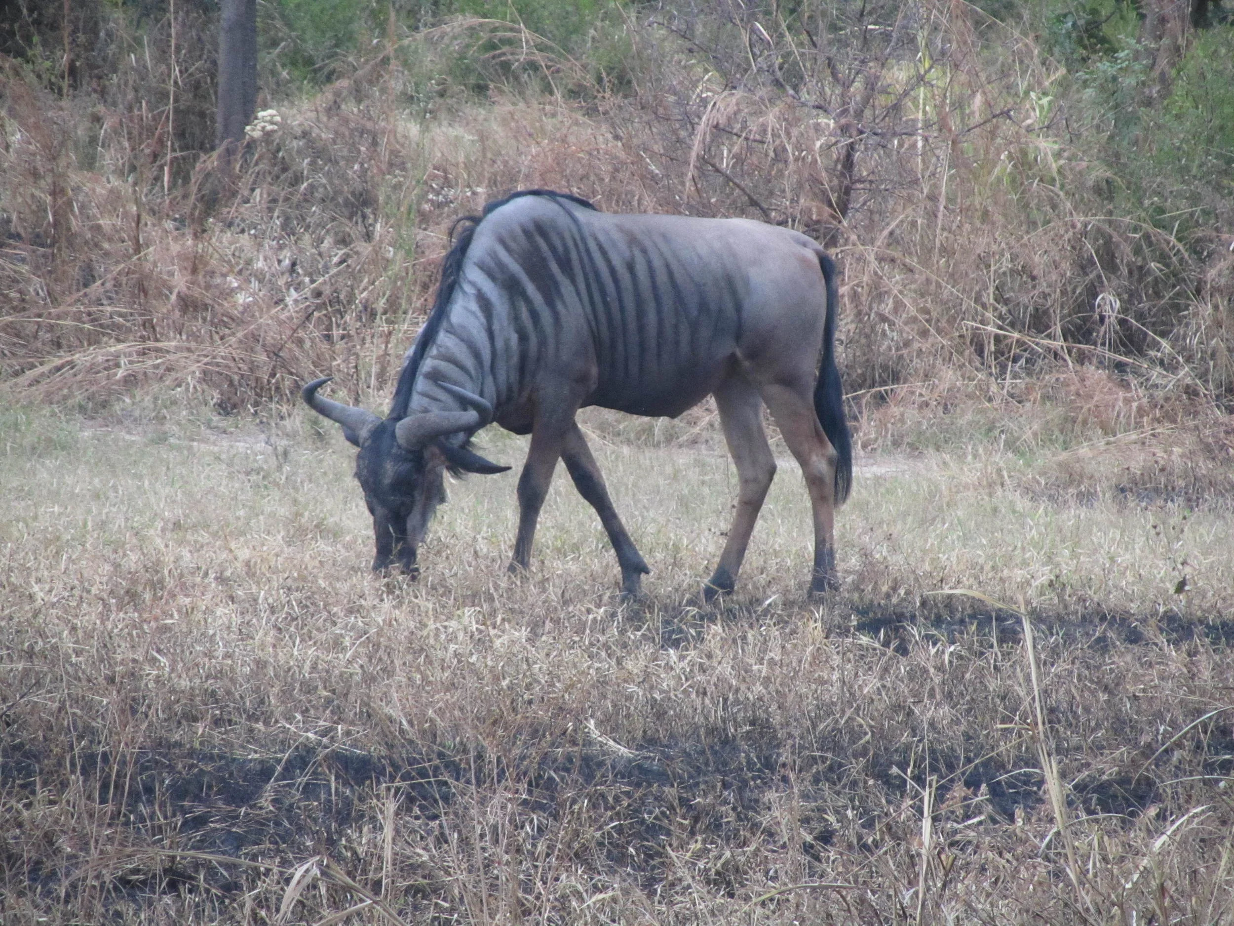 A wildebeest grazing in a dry grassy field with some trees and bushes in the background.