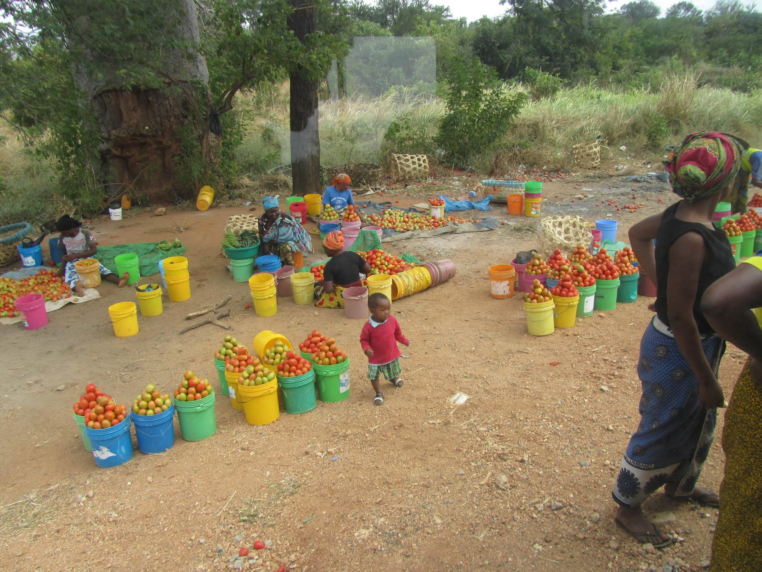 An outdoor market scene with women and children selling and buying tomatoes and other produce in a rural area.