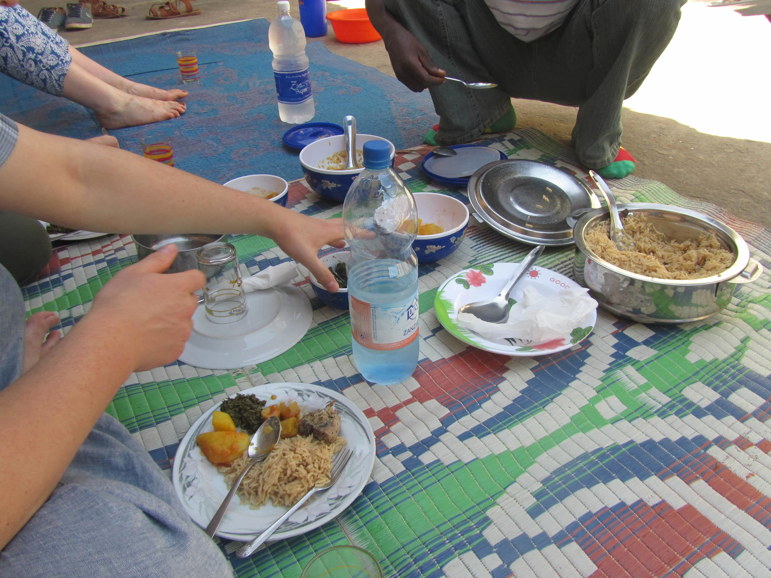 An outdoor meal setup with a colorful woven blanket, bowls of food, plates with rice and vegetables, a large bowl of rice, a bottle of water, and people serving and eating food.