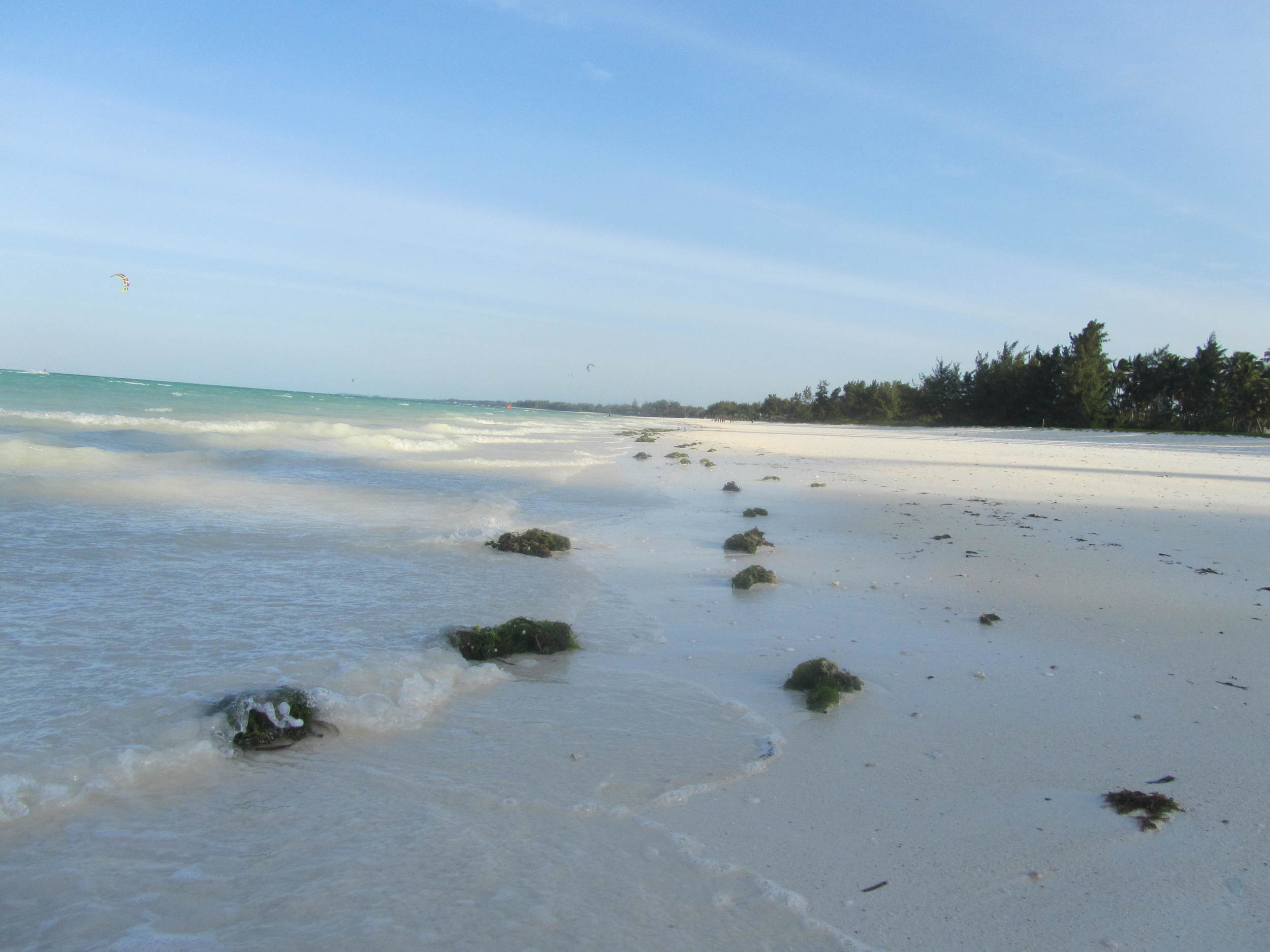 A serene beach with white sand, small rocks covered in seaweed along the shoreline, calm waves, and a line of trees in the distance under a blue sky with faint wispy clouds.