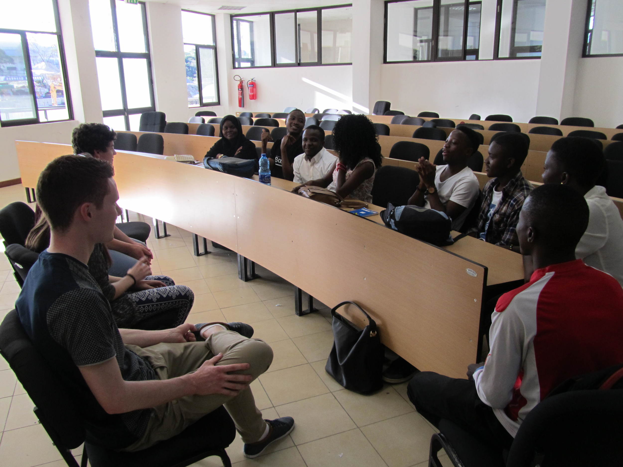 A group of diverse young adults sitting around a U-shaped conference table in a bright, modern room with large windows, engaged in a discussion or meeting.