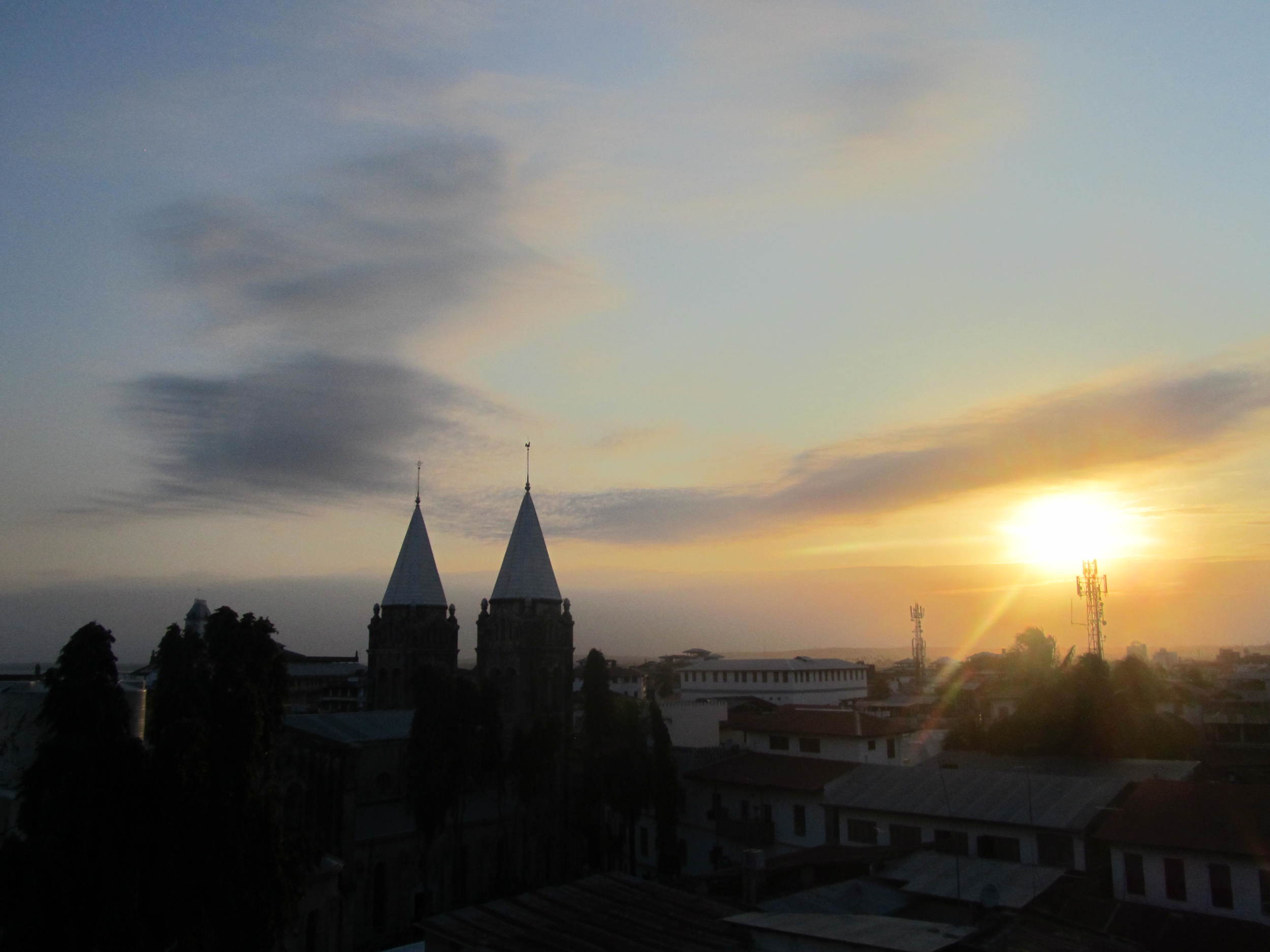 Sunset over a city with two church towers with conical roofs and several modern communication towers in the background.