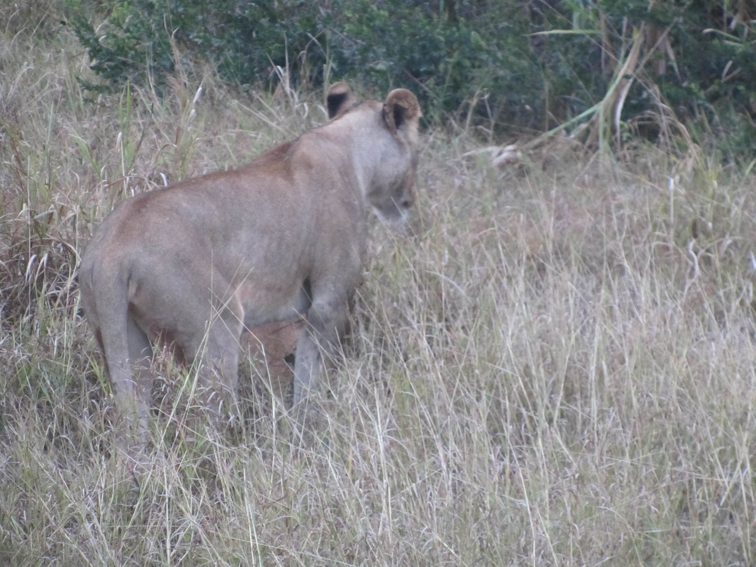 A lioness standing in tall grass in a natural habitat with bushes in the background.